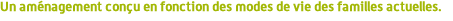 - Le rez-de-chaussée est presque exclusivement composé d'un seul espace à vivre. La cuisine, qui s'ouvre sur la salle à manger, s'organise autour d'un îlot central à la fois pratique et convivial. Un cellier permet de libérer l'espace.